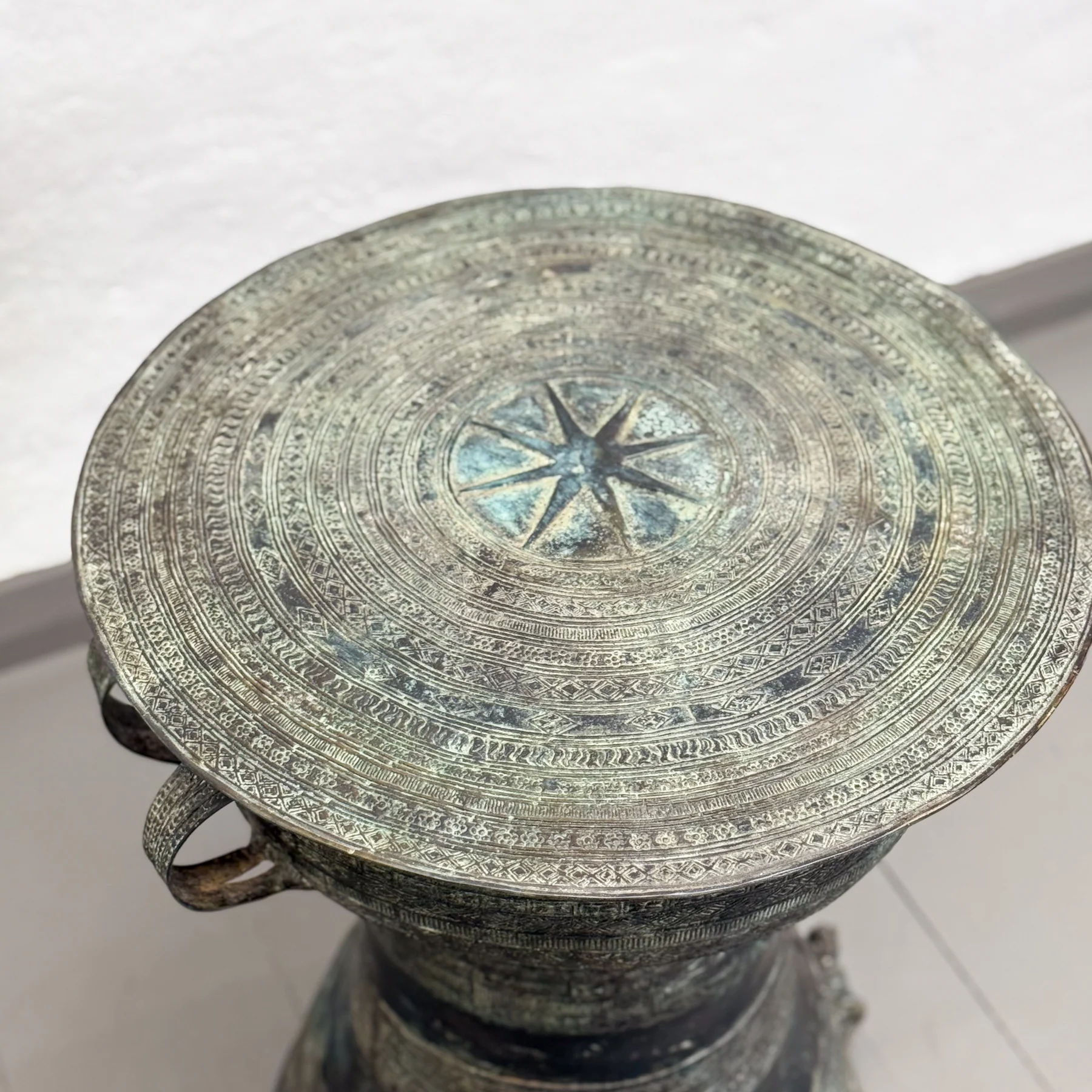 Taller and more slender than other styles, this elegant bronze rain drum draws from traditional Thai ceremonial designs and is carefully reproduced in Bali. Adorned with intricate detailing and the symbolic elephant trail motif, it features a weathered verdigris patina that lends age and character. Its graceful proportions make it ideal as a side table, a plant pedestal, or a sculptural accent in any number of settings. A beautiful way to introduce Southeast Asian heritage and Balinese artisanal craftsmanship into refined, worldly interiors.