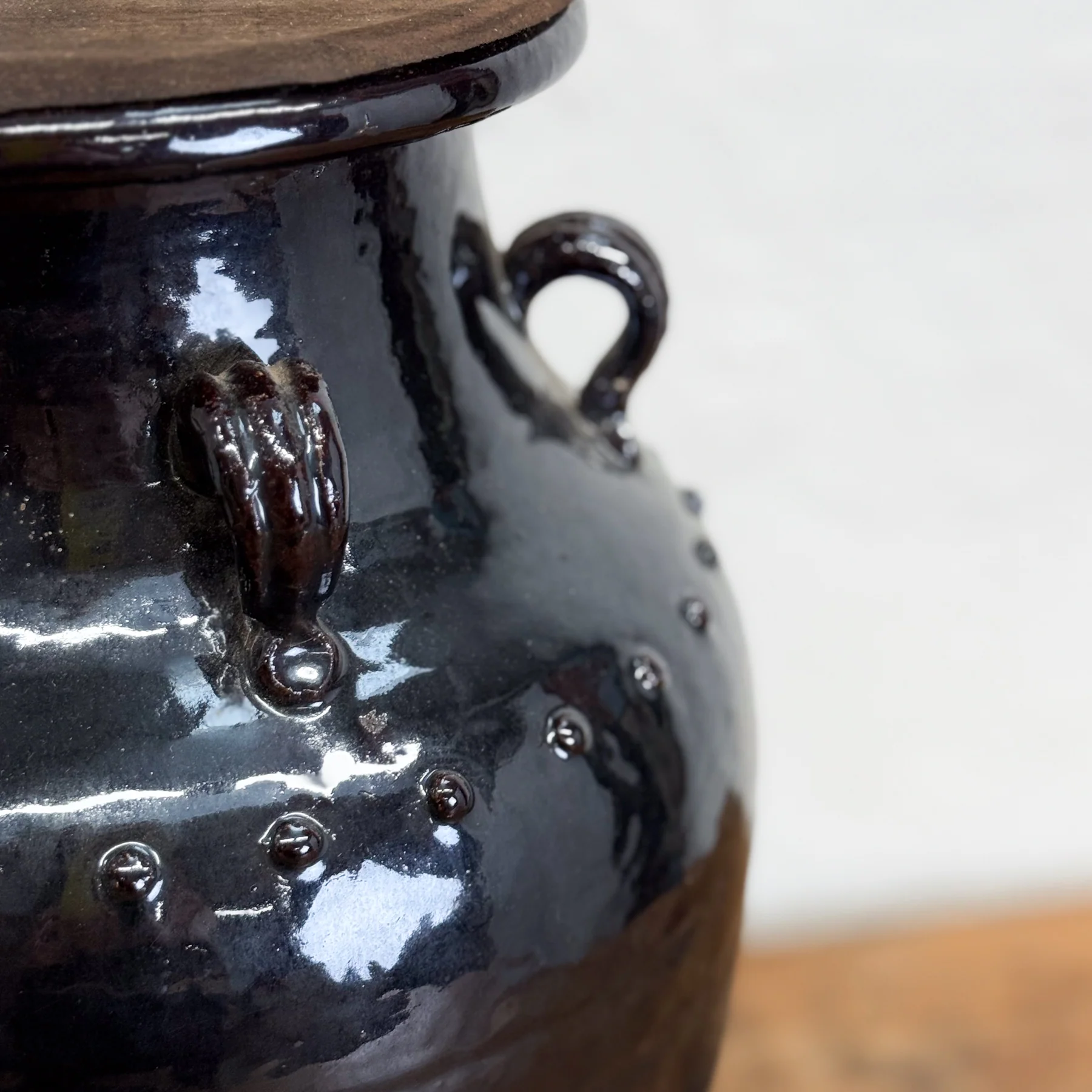 A beautiful pot handmade in Bali in a bold deep blue black glaze with small side handles and ready to be converted into a lamp. We stock various lamp shade shapes and sizes. Enquire today about making this a unique lamp for your living area.Ā