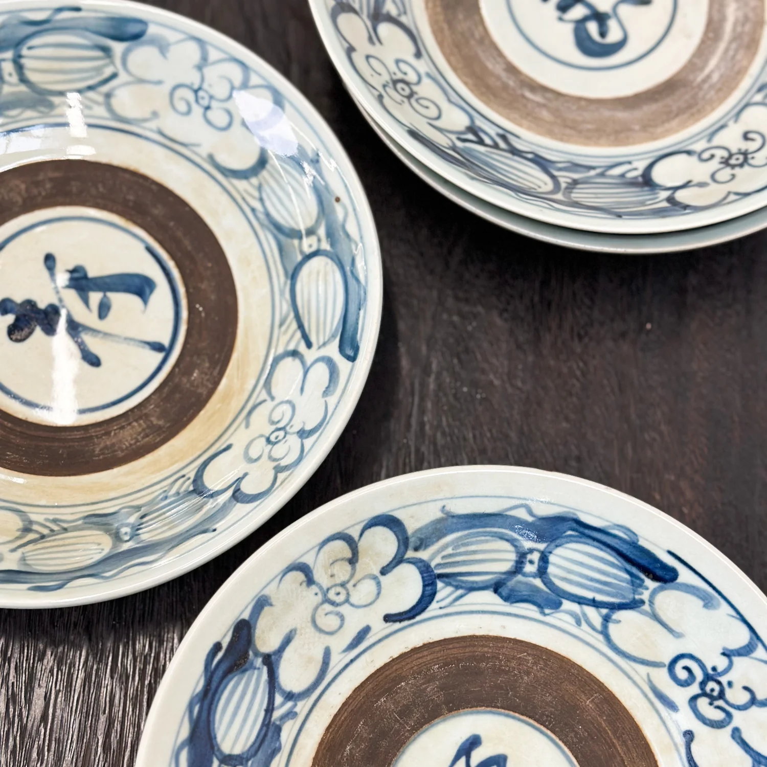 Displayed fixed to a wall or propped on a buffet or table, these old Chinese porcelain plates (about the size of a small dinner plate) bring a touch of the orient to your interior spaces. Hand-painted with blue clouds and calligraphy each piece is unique and special.