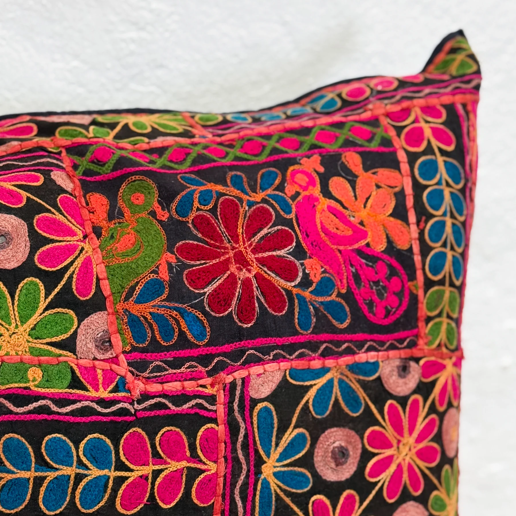 A maximalist’s dream, this large cushion bursts with high-contrast floral embroidery in near-neon hues on a dramatic black cotton base. Handcrafted in India, it’s a joyful statement piece that brings playful energy to any setting.