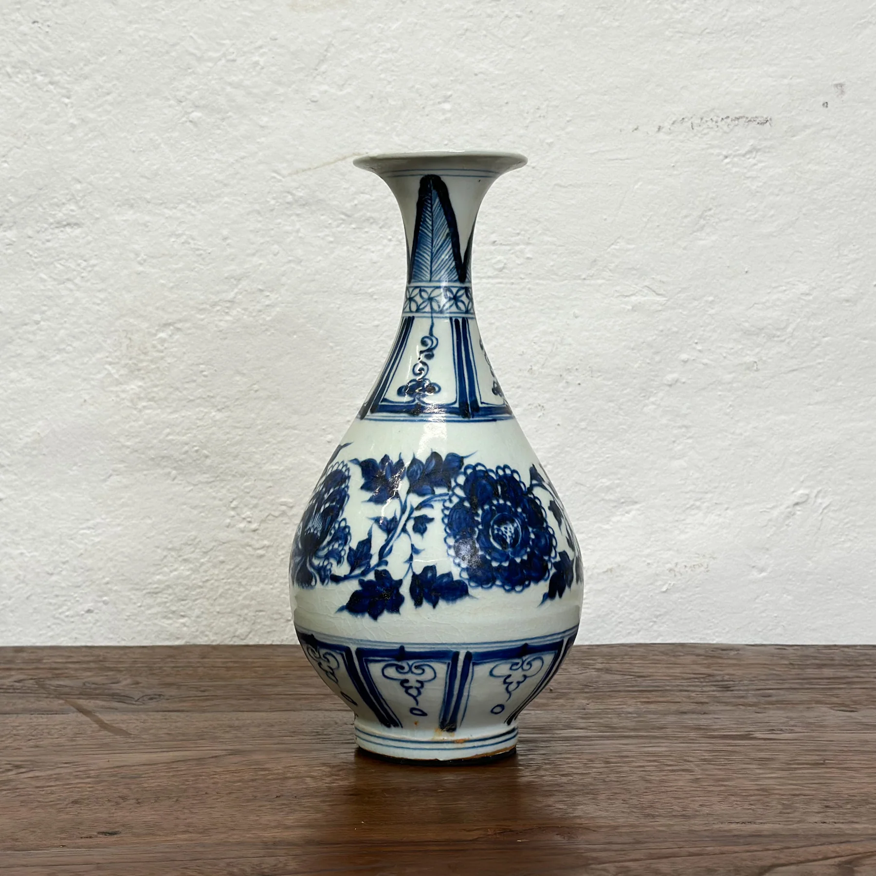 This vase has a unique elegance of form and the vase painter has respected its form in his design. He has used the peony, a favourite of vase painters as the main emblem of his concept. The bands of decoration respond to the sensuous form of the vase. This is a desirable collector’s item.