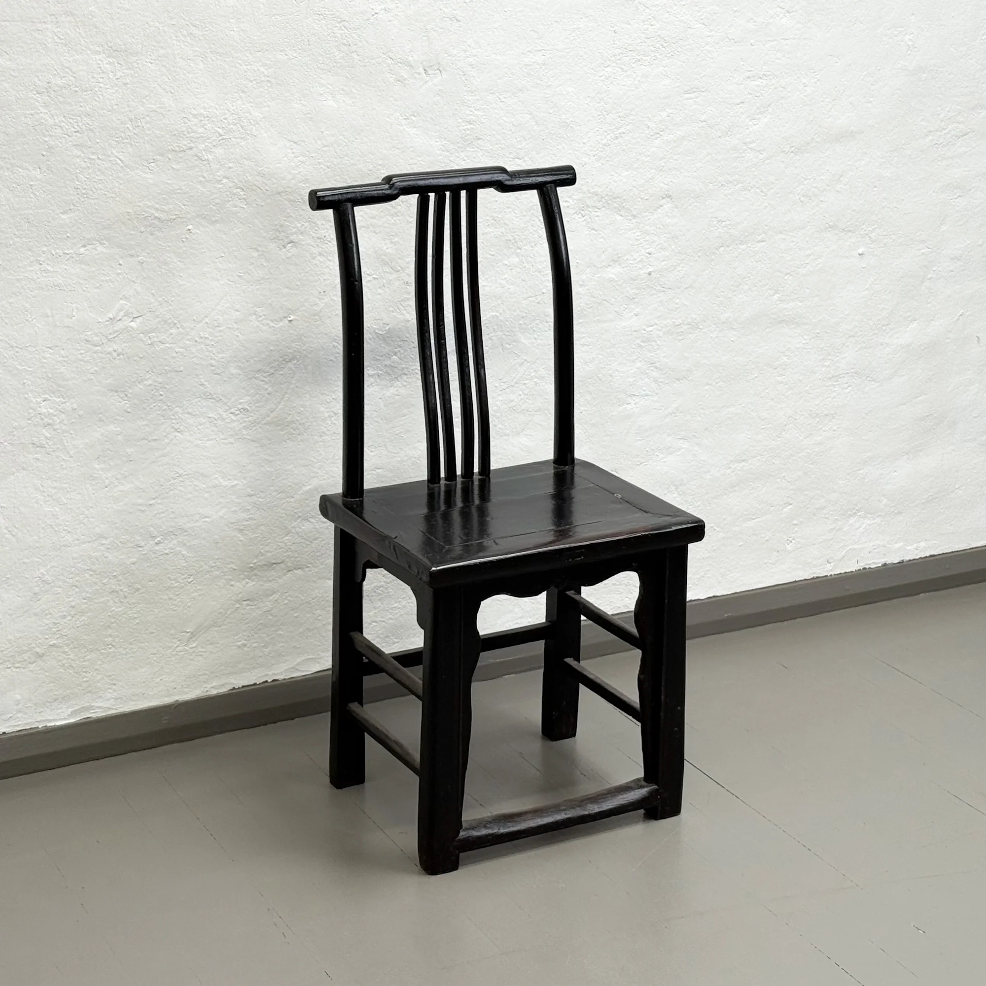 Finely crafted in solid elm with a deep black–brown lacquer enlivening the grain, this sculptural Southern Style Armless Lacquered Chair makes a standalone statement piece in the room or a formal dining setting. It offers strong graphic presence and a sense of gravitas, anchoring contemporary, minimalist, or Asian-inspired interiors with notable restraint and elegance.