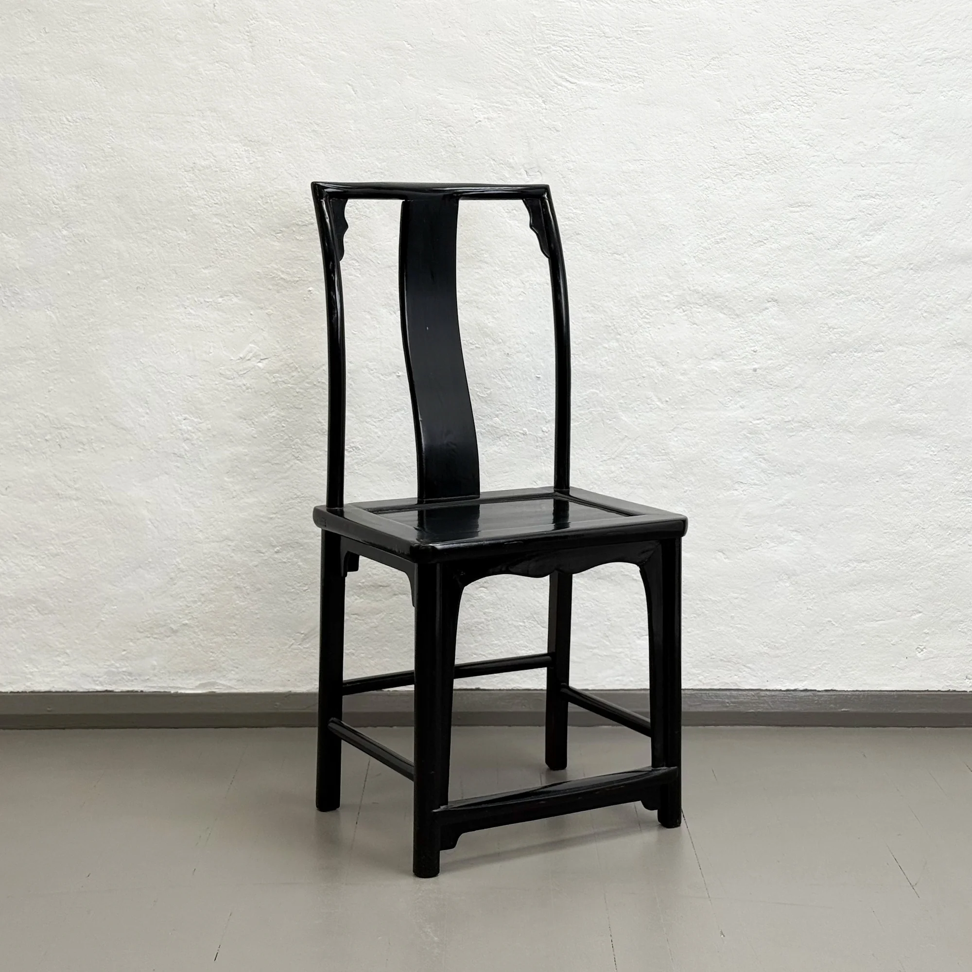 Crafted in solid wood and finished in a rich black lacquer, this Southern-style Chinese yoke-back side chair has a gently waisted back splat that echoes the natural curve of the spine. Its elegant, sculptural profile works beautifully as a dining chair around or as a single accent chair in a hallway, bedroom corner, or study. Style it with a cushion or leave it bare to showcase its refined silhouette and traditional joinery.