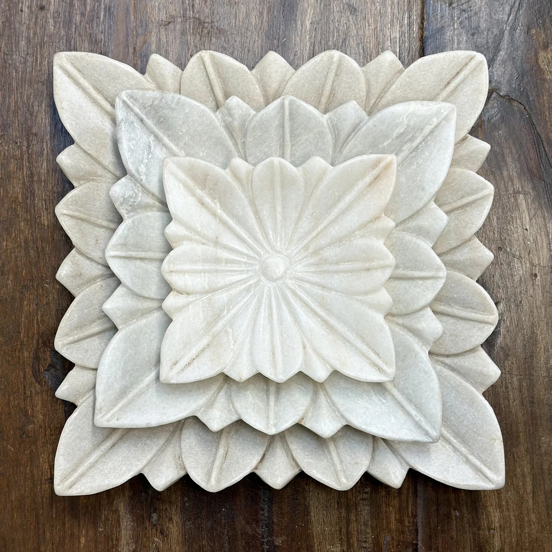 A Square Flower Marble Plate is a square-shaped decorative platter crafted from marble. It features a central design with intricately carved motifs, adding a touch of elegance to any space. This plate is both functional and a visually pleasing artistic item.