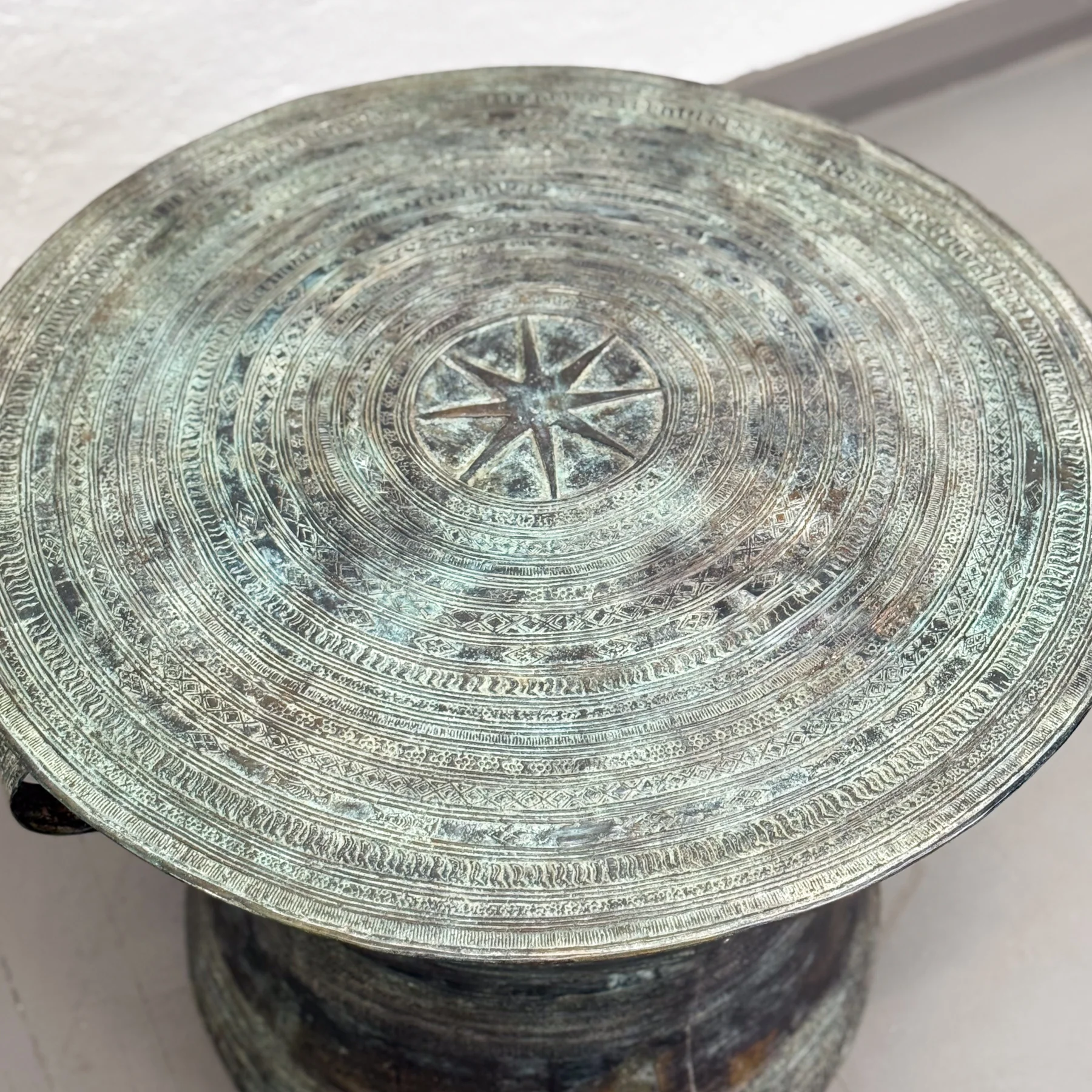 Inspired by traditional Thai rain drums, this large squat bronze version has been skilfully reproduced in Bali, preserving the ceremonial elegance of the original form. Its wide, low profile is adorned with intricate patterns and the signature elephant trail motif around the top. Finished in a weathered verdigris patina, it’s a versatile and artful addition to a space. Style it as a compact side table, a sculptural accent, or a unique pedestal for plants or decor. Perfect for adding texture and cultural depth to Balinese, coastal, or earthy interiors.
