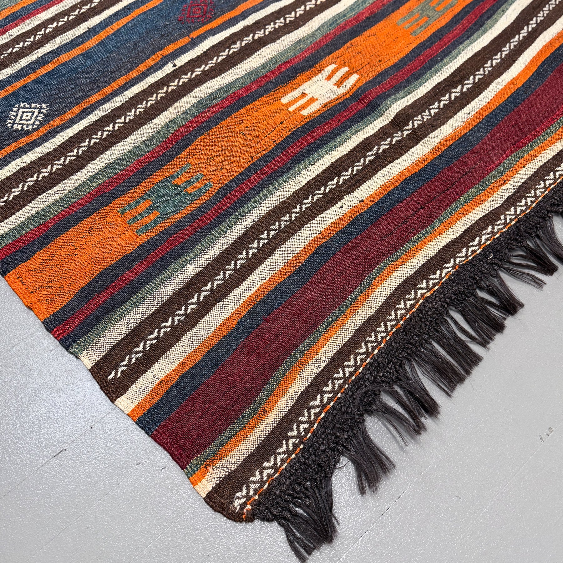 A refined addition to any space, this vintage Karakecili kilim offers a beautifully simple banded design, enriched by a timeless jewel-toned palette. Its horsehair fringe adds tactile detail and traditional flair. Handwoven in wool, it’s a piece that balances restraint and richness.