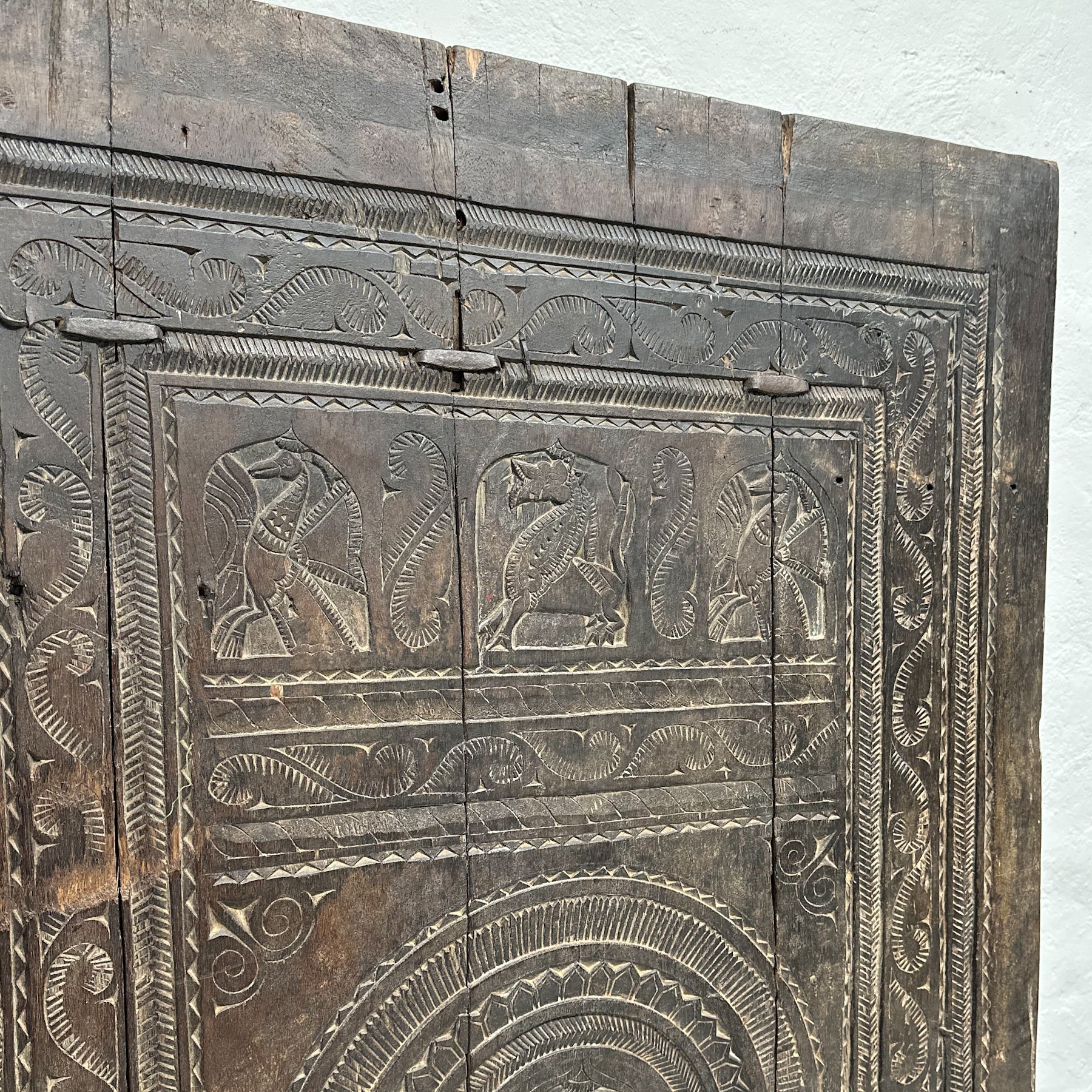 This exquisite handcarved door panel would provide a unique artistic entryway to a house or garden. It makes an impactful statement that what lies beyond it will be equally exciting. But it can be used to give textural interest to an indoor or outdoor space when used as a standalone work of art.